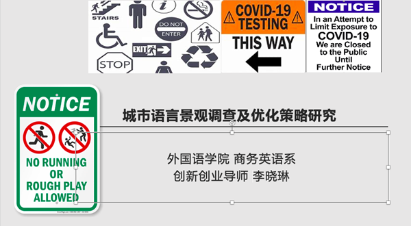 2023年5月11日晚19:00-21:00,外国语学院面向全院学生开展创新创业讲座。外国语学院教师李晓琳作题为“城市语言景观调查及优化策略研究”的讲座。李晓琳老师结合自身研究经历,以城市主要公共场所公示语汉英、汉日译写现状调查及其优化策略研究为例,向同学们介绍了小型语言景观调查研究方法、公示语多模态语料资源的收集、标注及其应用前景。