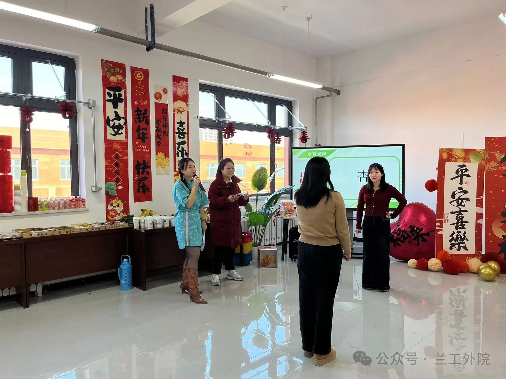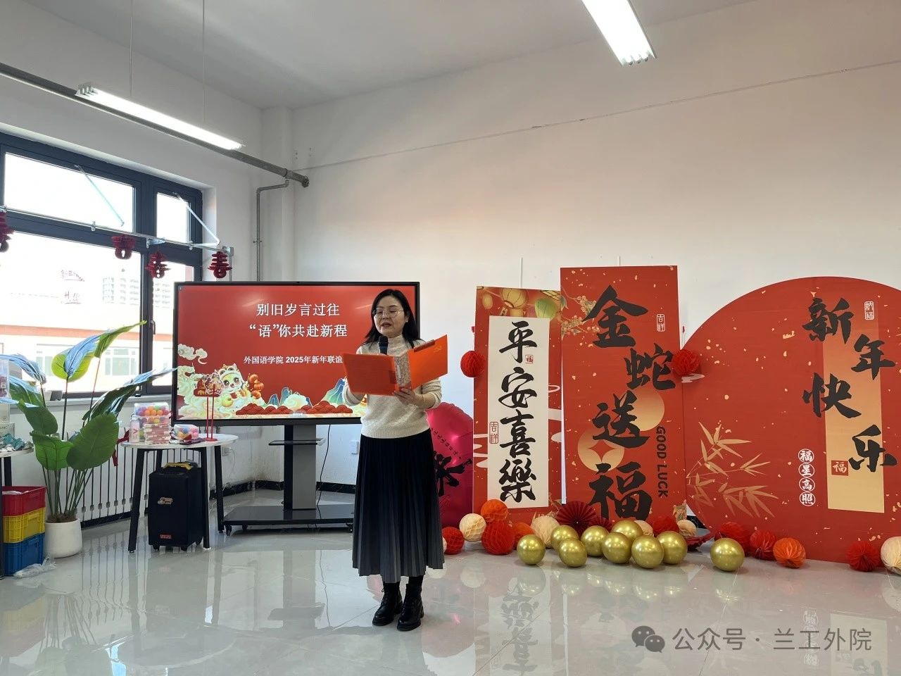 外国语学院于 12 月 31 日下午在文科实训楼 5 楼学院党员之家成功举办“别旧岁言过往 ‘语’你共赴新程”新年联谊会。活动旨在回顾过去一年学院的成长与收获,加强老师们之间的交流与互动,激发全体教师团结奋进、共创未来的热情。