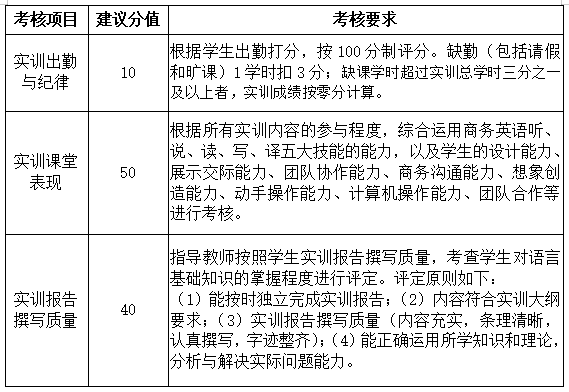 考核环节包括实训出勤与纪律,实训课堂表现,实训报告撰写质量,满分100分。各考核环节所占分值比例可根据具体情况进行微调,建议值及考核要求如下。
